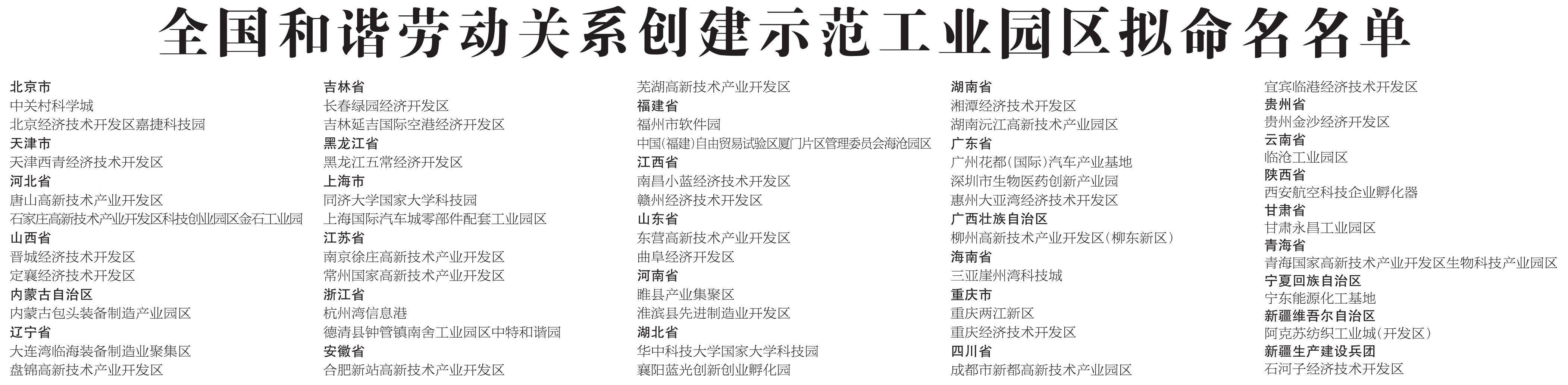 全国和谐劳动关系创建示范工业园区拟命名名单