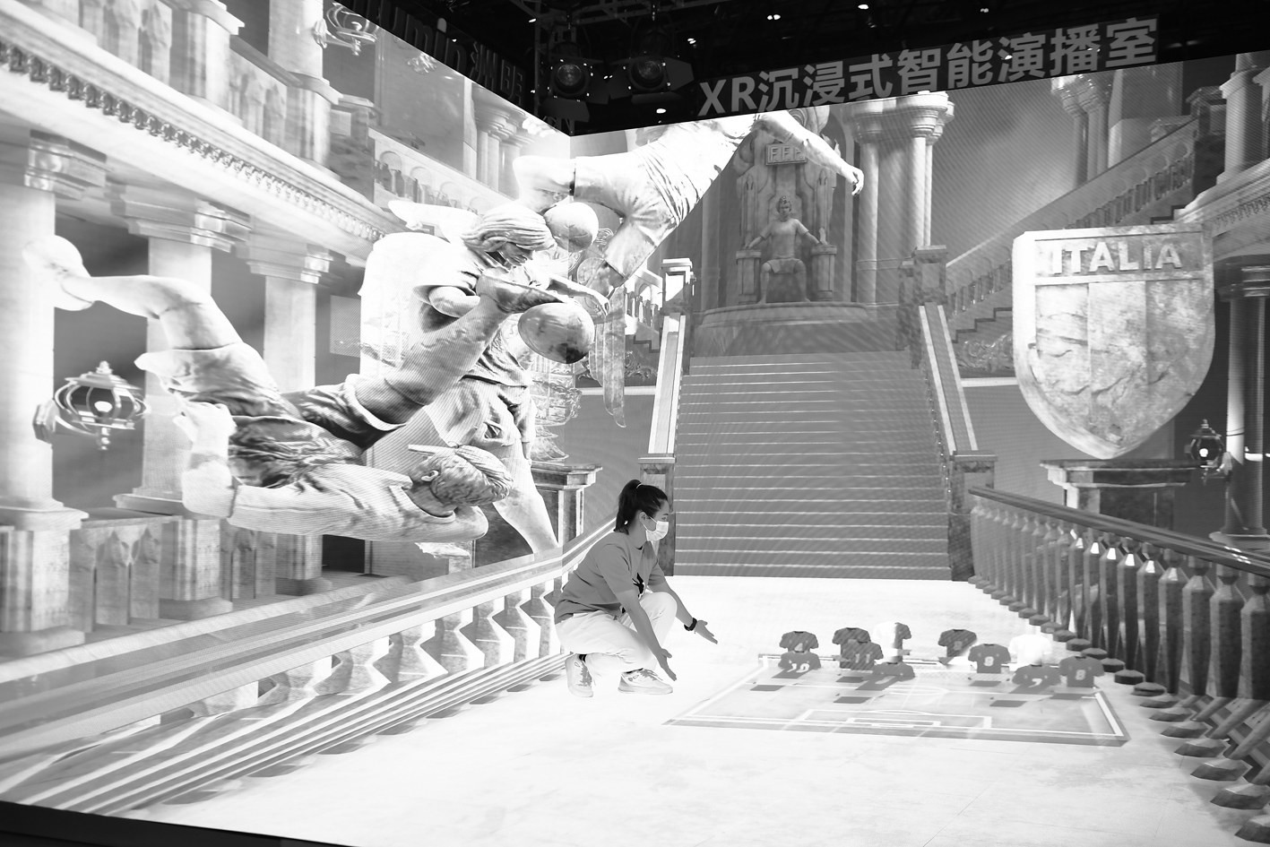 8月30日,2022中国新媒体大会在湖南长沙开幕,大会主题为“新主流新征程”。图为工作人员在“新技术融创新高地”2022中国新媒体技术展上展示XR沉浸式智能演播室。