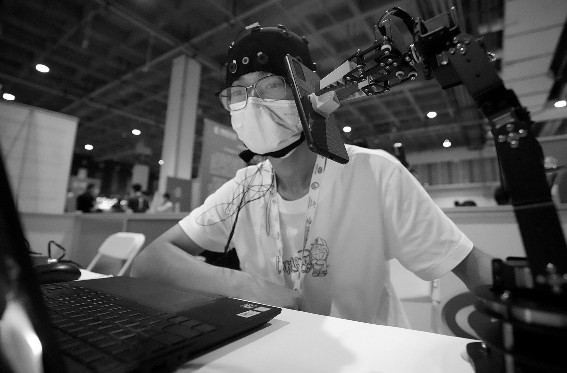 (图) 2022世界机器人博览会日前在京举行。图为工作人员在演示脑控机械臂拿手机。人的双手被占用时,可通过脑电信号控制机械臂拿东西。新华社记者王毓国/摄