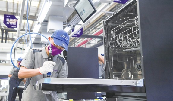 9月25日,设计年产能100万台的重庆海尔洗碗机互联工厂正式投产。重庆海尔洗碗机互联工厂位于重庆市江北区港城工业园,总建筑面积4.2万平方米,依托5G、工业互联网等先进技术,实现生产过程的数字化和智能化,在保证产品品质的同时有效提升生产效率,预计达产后年产值20亿元。图为当日工人在重庆海尔洗碗机互联工厂作业。