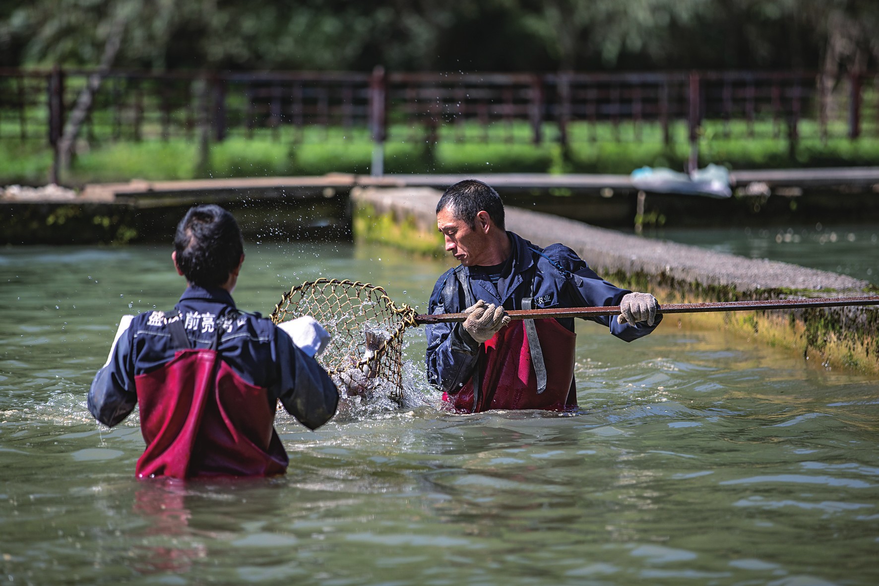 近年来,重庆市城口县蓼子乡充分利用区域内特有的生态资源,将冷水鱼养殖纳入特色产业发展,采取“企业+集体经济组织”的模式,依托重庆鲲池农业有限责任公司带动投资,每年从丹麦、挪威、美国等地引进优质虹鳟鱼、硬头鳟鱼卵35万粒,成为西南片区鳟鱼单一养殖规模最大的养殖场,并实现冷水鱼年产值2500万元。截至目前,蓼子乡冷水鱼养殖水面60余亩,年产量达60万斤左右,带动周围15名群众在该基地长期务工,每年带动农户增收40余万元,村集体经济增收10余万元。蓼子乡冷水鱼产业基地已成为城口县区域性特色产业之一。图为重庆市城口县蓼子乡明安村冷水鱼产业基地,工作人员在捕捞准备出售的虹鳟鱼。