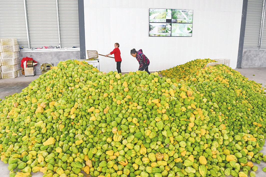 近年来,重庆市大足区通过引进龙头企业、完善基础设施、拓展产业链条、建立“公司+村集体+农户”的利益联结机制等举措,大力发展中药材产业,产业规模和效益不断提升。目前,大足区中药材种植面积达2.6万余亩,有力助推农民增收和乡村振兴。图为在大足区金山镇天河村,村民整理佛手。王全超/摄