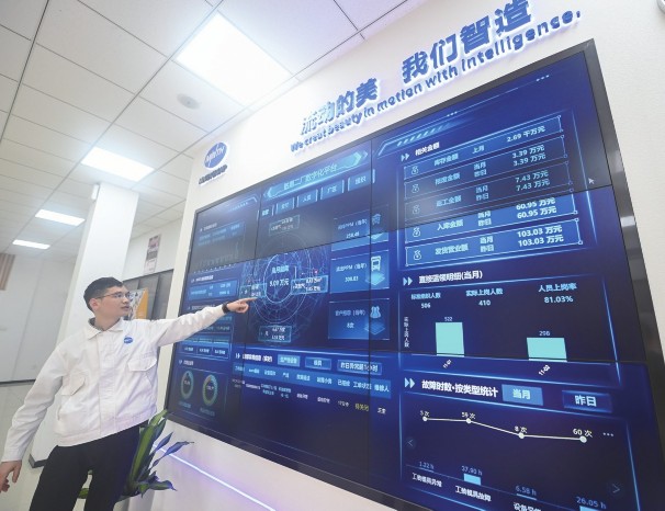 近年来,浙江省嘉兴市南湖区全力推进制造业数字化改造,实施“新智造”企业培育行动。围绕智能化改造—数字化车间—智能工厂—未来工厂的梯度培育体系,推动企业以数字化、绿色化为核心的技术改造,加速全区制造业实现蝶变跃升。截至目前,全区累计认定省级未来工厂1家、智能工厂(数字化车间)5家,组织27家企业纳入培育库。图为11月2日在嘉兴南湖区的嘉兴敏惠汽车零部件有限公司的数字大屏上实时显示产品合格率等信息。