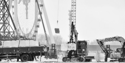 近日,第24届哈尔滨冰雪大世界在严格落实各项疫情防控措施前提下,有序展开冰建项目施工。本届哈尔滨冰雪大世界园区面积为81万平方米,冰雪用量预计达到15万立方米。图为园区冰建项目施工现场。