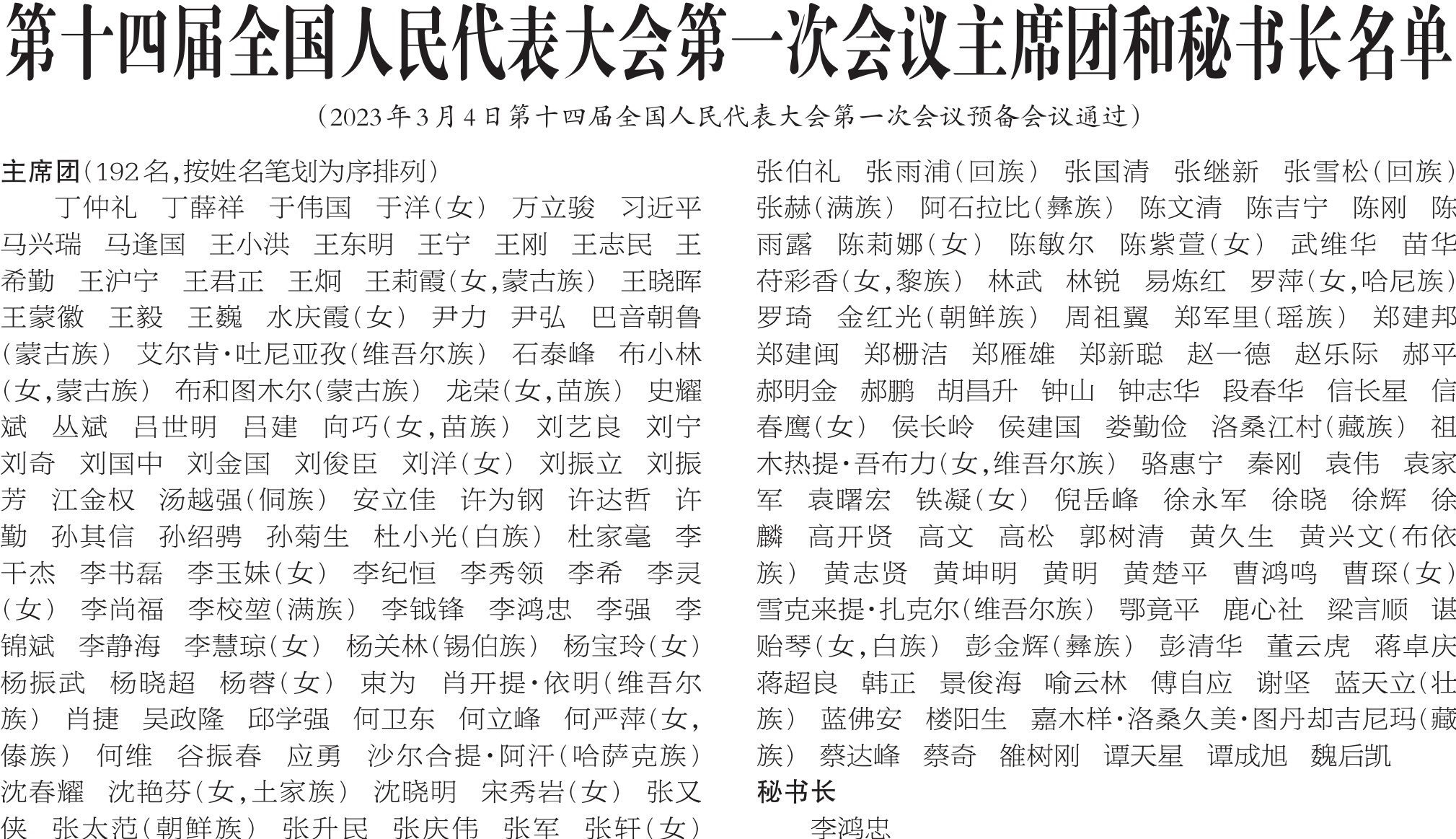 第十四届全国人民代表大会第一次会议主席团和秘书长名单
