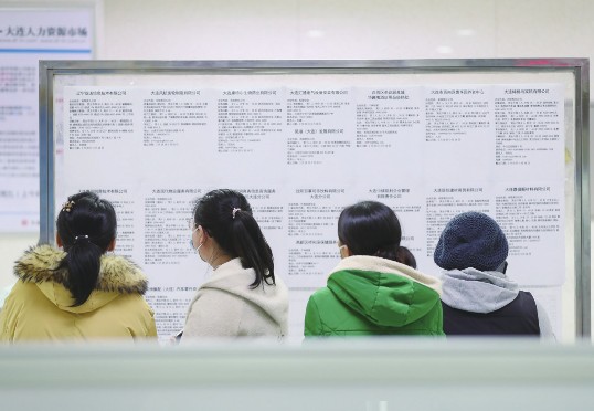 “三八”国际劳动妇女节当日,大连市采用线上和线下同步进行的方式举办女性劳动者和女大学生专场招聘会。近百家单位提供了两千余个就业岗位,吸引众多求职者。图为三月八日,求职者在大连市人力资源市场查看招聘信息。新华社记者龙雷摄