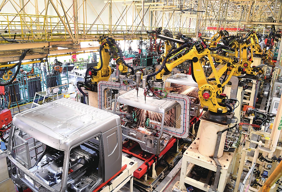 (图2)在柳州市柳东新区一家汽车企业的智能工厂里,工业机器人在生产线进行焊接作业