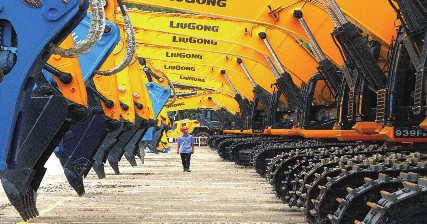 (图3)在广西柳工集团整机库,工人正在查看新型机械产品