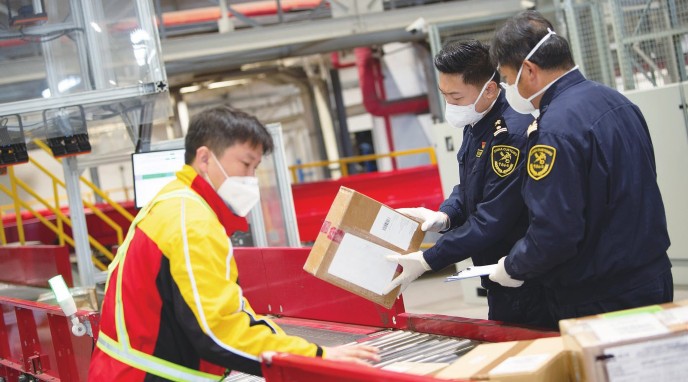 近期,随着国际客货运航班增加,海关部门的国际快件业务也逐步回暖。在北京,首都机场海关采取提前预约、优先审单、7×24小时验放等多项措施提高商品进出口通关效率,在保障国际快件进出口安全的同时进一步服务快件企业。图为3月20日,首都机场海关关员在一家快件企业的海关监管仓库查验快件。