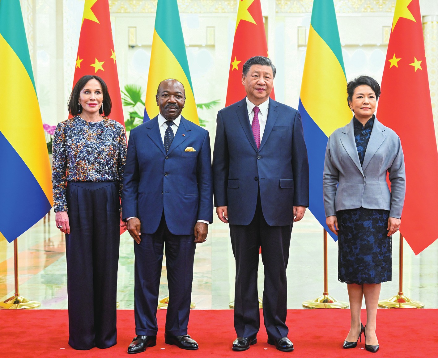 (图)四月十九日下午,国家主席习近平在北京人民大会堂同来华进行国事访问的加蓬总统邦戈举行会谈。这是会谈前,习近平和夫人彭丽媛同邦戈和夫人西尔维娅合影。新华社记者李学仁/摄