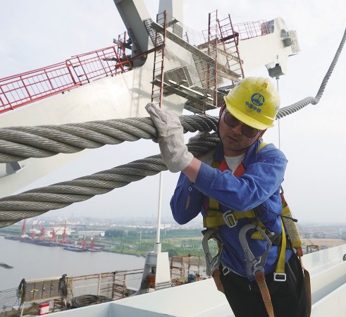 5月21日,在中铁大桥局常泰长江大桥录安洲专用航道桥施工现场,工人在卸钢梁杆件。常泰长江大桥连接江苏常州和泰州两市,全长10.03公里,是一座集高速公路、城际铁路和普通公路为一体的过江通道。目前,大桥建设正在有序推进中。