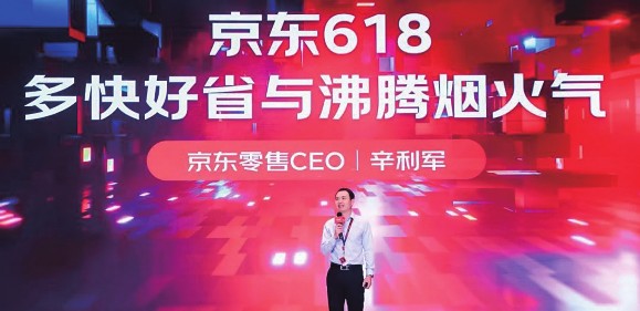 图为京东零售CEO辛利军在京东618启动发布会上演讲