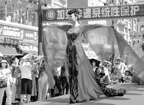 ⑦乌鲁木齐开展非物质文化遗产展示展演展销活动,6月9日,在乌鲁木齐大巴扎景区,模特在活动现场展示艾德莱斯绸制作的时装。