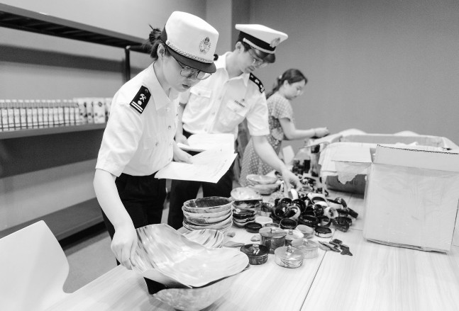 6月19日,在长沙国际会展中心,长沙海关所属星沙海关关员现场核对单货。当日,第三届中国—非洲经贸博览会首批入境参展展品完成通关手续后运抵长沙国际会展中心。主题为“共谋发展、共享未来”的第三届中非经贸博览会将于6月29日至7月2日在湖南长沙举办,是今年中国同非洲国家在经贸领域最为重要的交流活动之一。