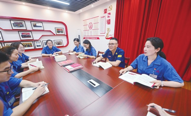 6月27日,胡晓丽(右一)等党员职工在桐昆集团的工作室内开展主题党日活动。位于浙江嘉兴桐乡的桐昆集团是一家投资石油炼化,以聚酯和涤纶长丝制造等为主业,兼跨多领域的大型民营企业。近年来,桐昆集团以“争双强·当先锋”为目标,形成了党建引领发展、党建融合发展、党建服务发展、党建创新发展、党建智慧发展的格局。集团自2001年起,已连续21年位列中国企业500强。