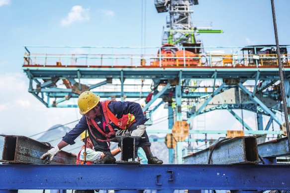 日前,纳晴高速牂牁江大桥主缆牵引顺利完成,大桥上部结构施工陆续转入紧缆、吊索安装和主桥钢桁梁吊装阶段,为纳(雍)晴(隆)高速全线通车进一步创造有利条件。牂牁江大桥位于贵州省晴隆县和普安县交界处,大桥全长1849米,主跨1080米。图为贵州公路集团工人在纳晴高速牂牁江大桥进行施工。