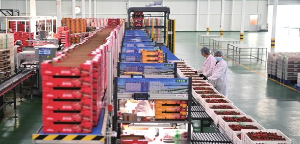 近年来,地处祁连山北麓、河西走廊中段的甘肃省张掖市民乐县充分挖掘戈壁农业资源潜力,大力发展节水农业、旱作农业、戈壁生态农业,建设百亿级现代丝路寒旱农业智能温室产业园。截至目前,该县已建成投用50万平方米的高标准智能玻璃温室,种植的串收番茄销往我国华东、华南等区域。图为张掖市民乐工业园内的一家农业公司,工作人员在串收番茄分拣包装线上忙碌。新华社记者范培珅/摄