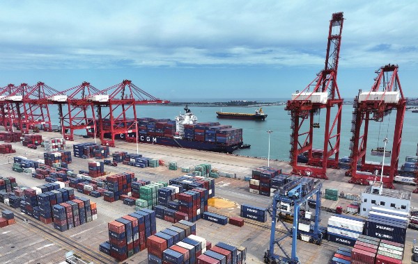 据统计,2023年上半年,江苏连云港港累计完成货物吞吐量1.49亿吨,同比增长11.7%;集装箱完成284.36万标箱,同比增长15.4%。图为货轮在江苏连云港港集装箱码头泊位上装卸集装箱(无人机照片)。
