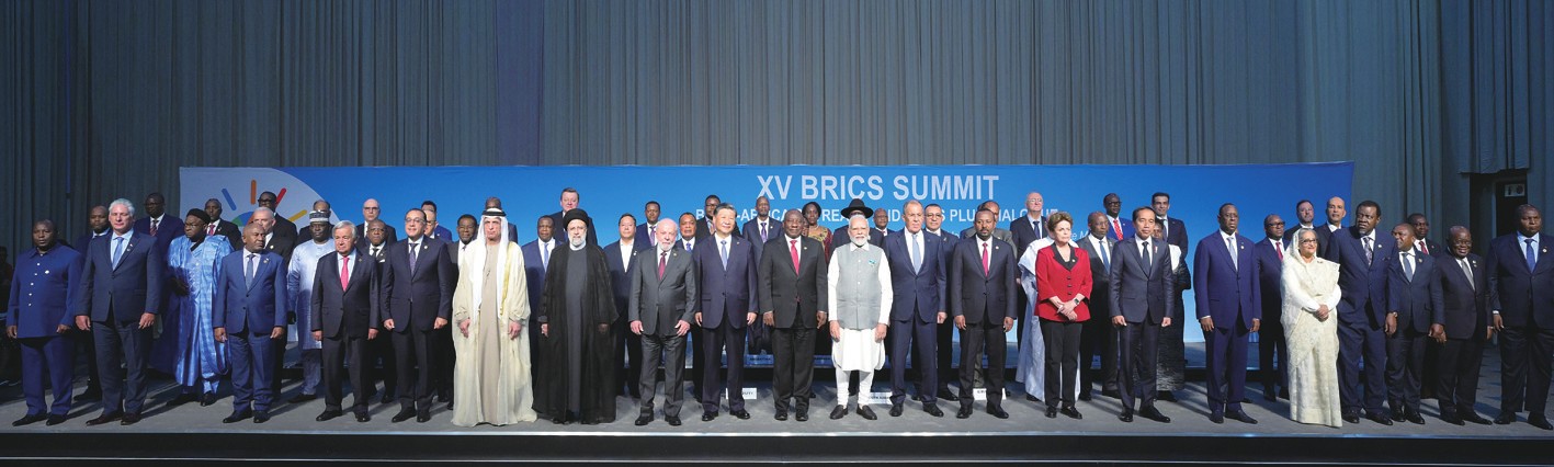会议由南非总统拉马福萨主持,巴西总统卢拉、印度总理莫迪、俄罗斯总统普京(线上)和60多位非洲国家及其他新兴市场和发展中国家领导人或代表,以及联合国秘书长古特雷斯、新开发银行行长罗塞夫等国际和地区组织负责人出席。这是与会领导人集体合影。新华社记者李学仁/摄