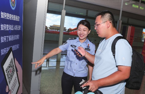 国家移民管理局聚焦出入境人员“急难愁盼”问题,出台便民利民举措102项。恢复内地居民赴港澳团队旅游签注“全国通办”,实施内地居民赴港澳探亲、工作、学习证件“全国通办”政策,186万余人次内地居民享受到便利。针对港澳居民因疫情未能及时办理来往内地通行证到期换发手续,推出延期新政,截至日前已有270余万人次港澳居民持延期证件顺畅通关,596万余人次享受身份核验便捷服务。国家移民管理局改造升级边检通关设施,在确保国门边境安全的前提下满足人民群众便捷通关需求。上半年全国移民管理机构共查验出入境人员1.68亿人次,检查交通运输工具983.1万架(艘、列、辆)次,分别同比增长169.6%、119.2%。图为在首都机场3号航站楼,移民管理警察丁欣在为旅客介绍“北京边检在线”公众号的使用方法。
