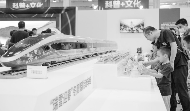 9月17日,在全国科普日北京主场活动展区,参观者参观展出的高铁模型。9月16日,以“提升全民科学素质、助力科技自立自强”为主题的2023全国科普日主场活动在北京首钢园开幕。据介绍,主场活动汇聚全国104个单位的360个展项,通过多种形式的展示和体验,为公众特别是青少年提供趣味盎然的科学文化体验。