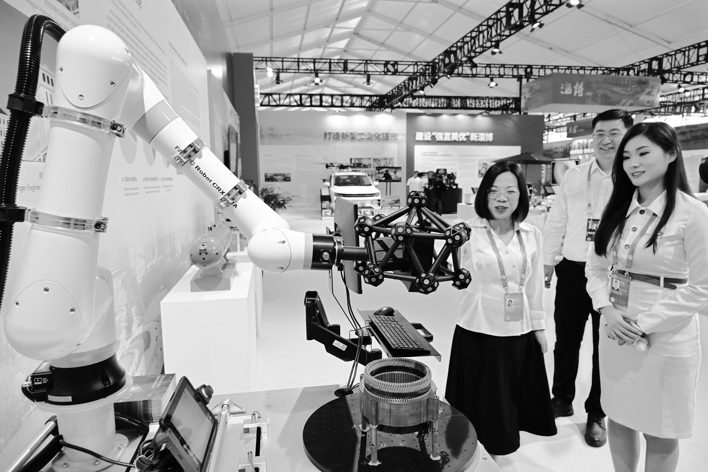 10月10日,观众在山东青岛参观“2023跨国公司与中国主题展”。当日,由商务部和山东省共同举办的第四届跨国公司领导人青岛峰会启幕。作为峰会配套展览活动,“2023跨国公司与中国主题展”集中展示了跨国企业在中国的发展战略、合作成果、前沿技术、先进产品等。参展企业共计231家,展品1600余件。