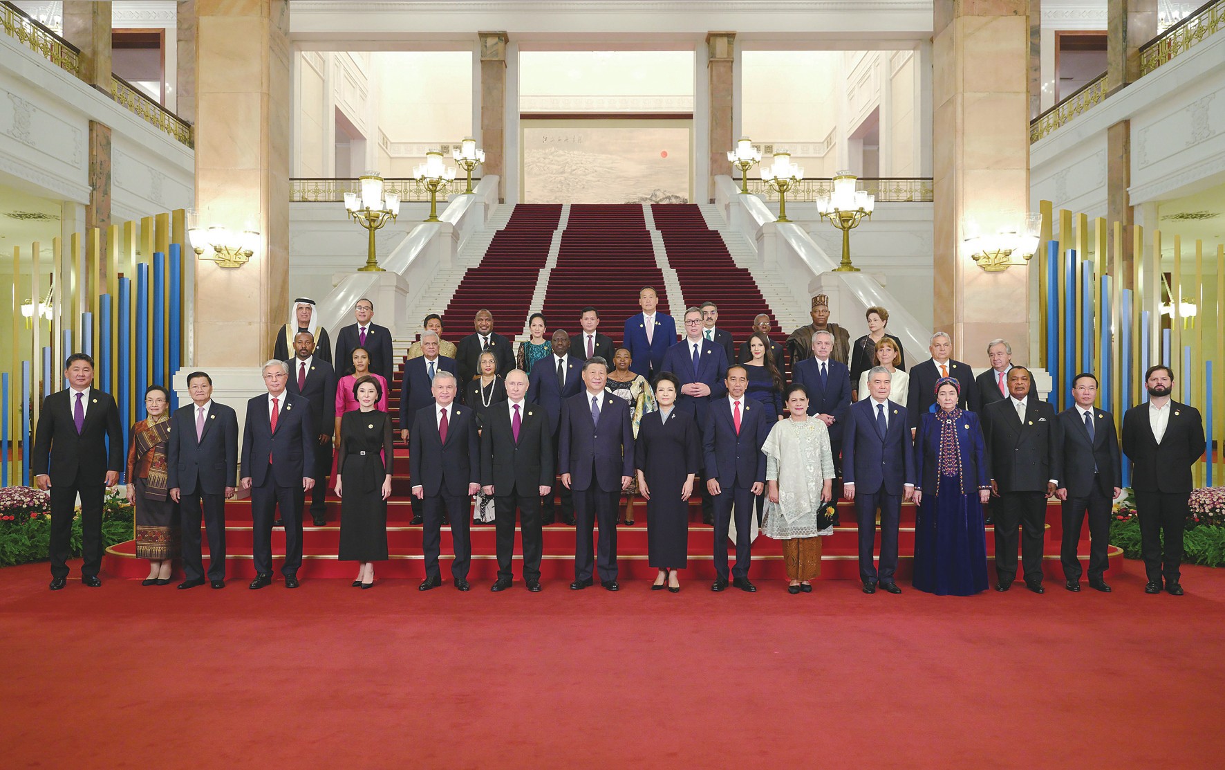 出席高峰论坛的外国国家元首、政府首脑、国际组织负责人等国际贵宾及配偶陆续抵达人民大会堂。礼兵列队致敬。150多面共建“一带一路”国家国旗和联合国旗,整齐分列红毯两侧,恢宏壮观。
