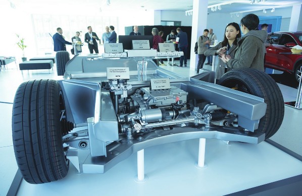 这是十月十七日在匈牙利布达佩斯拍摄的比亚迪电动汽车底盘系统。中国电动汽车制造商比亚迪在匈牙利首都布达佩斯的两家门店十月十九日正式开业,标志着比亚迪电动汽车正式进入匈牙利乘用车市场。