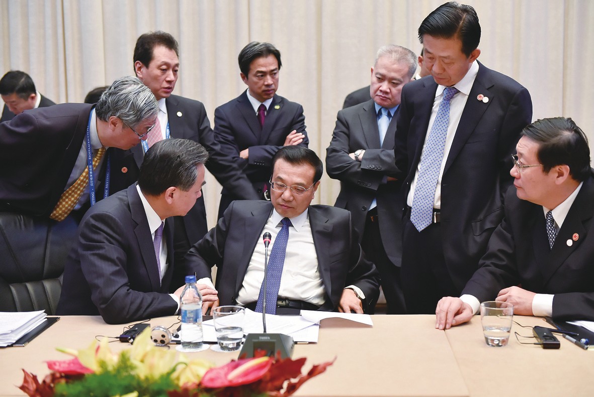 图⑨:2014年12月16日,李克强同志在贝尔格莱德出席第三次中国-中东欧国家领导人会晤。这是会谈间隙,他与随行部长进行会商。新华社发