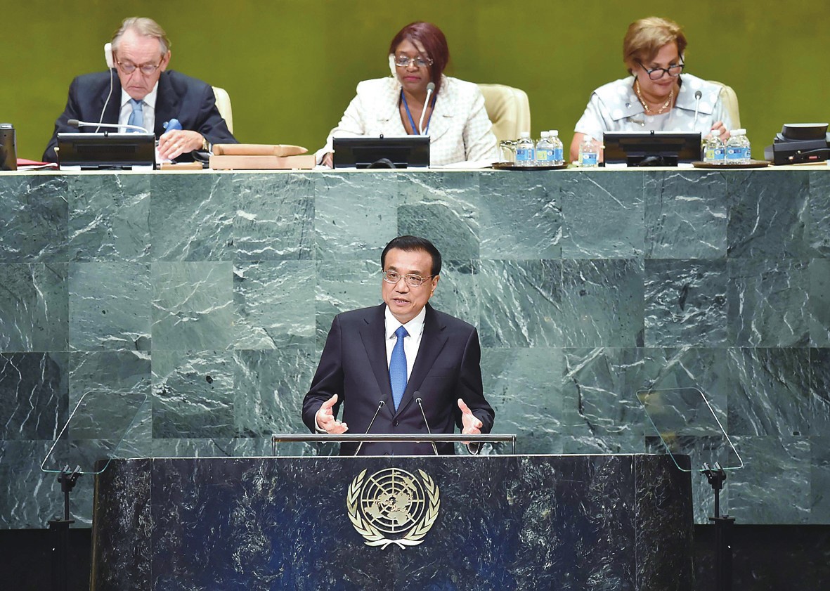 图⑾:2016年9月21日,李克强同志在纽约联合国总部出席第71届联合国大会以“可持续发展目标:共同努力改造我们的世界”为主题的一般性辩论并发表题为《携手建设和平稳定可持续发展的世界》的讲话。新华社记者李涛/摄