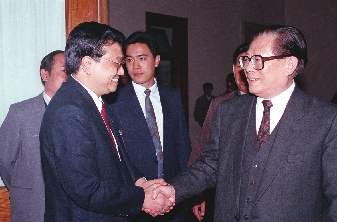 图②:1993年5月3日下午,中国共产主义青年团第十三次全国代表大会在北京人民大会堂开幕。在5月3日上午的预备会议后,举行第一次主席团会议,推选李克强等同志为主席团常务主席。这是江泽民同志与李克强同志握手。新华社记者郭占英/摄