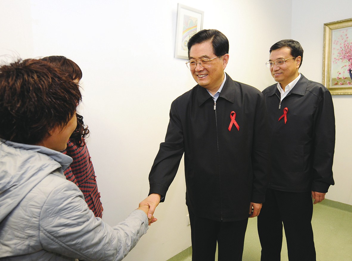 图③:2008年12月1日是第21个世界艾滋病日。胡锦涛同志和李克强同志来到北京地坛医院考察艾滋病防治工作。新华社记者马占成/摄