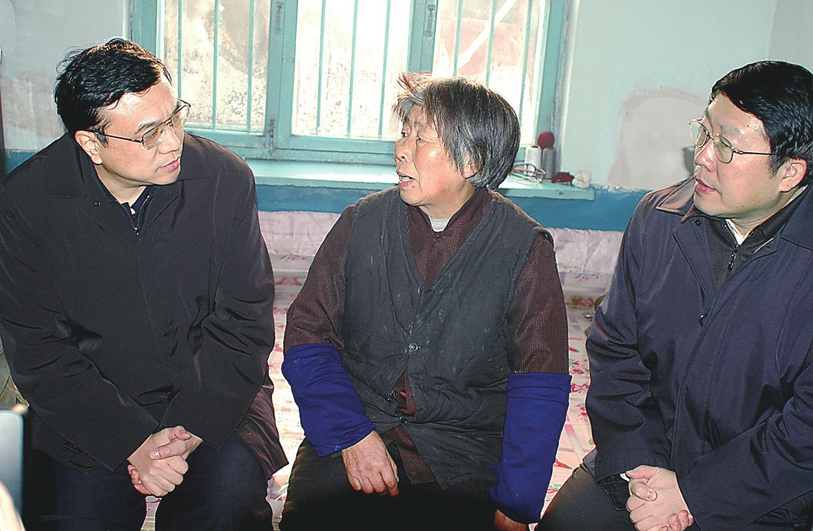 图⑤:2004年12月26日,李克强同志到辽宁省抚顺市莫地沟棚户区居民王淑贞家中走访调研。