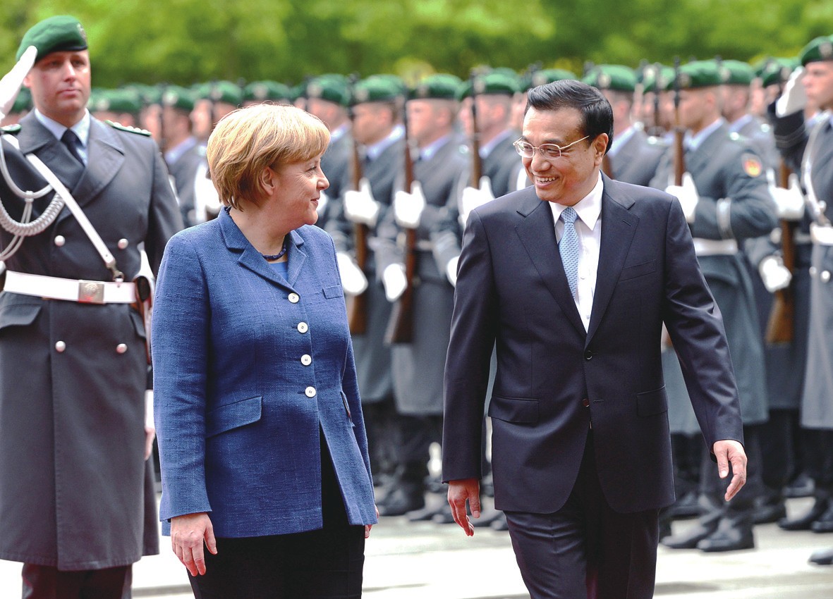 图⑥:2013年5月26日,李克强同志在柏林出席德国总理默克尔举行的欢迎仪式。新华社记者马占成/摄
