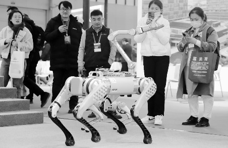 十二月六日,观众在工业机器人展区观看表演。当日,以﹃智改数转网联,数实融合创新﹄为主题的二○二三世界智能制造大会在南京开幕。大会期间开展线下展览,来自十个国家和地区的三百九十多家展商参展,展示智能制造领域最新成果、前沿技术和高端产品。
