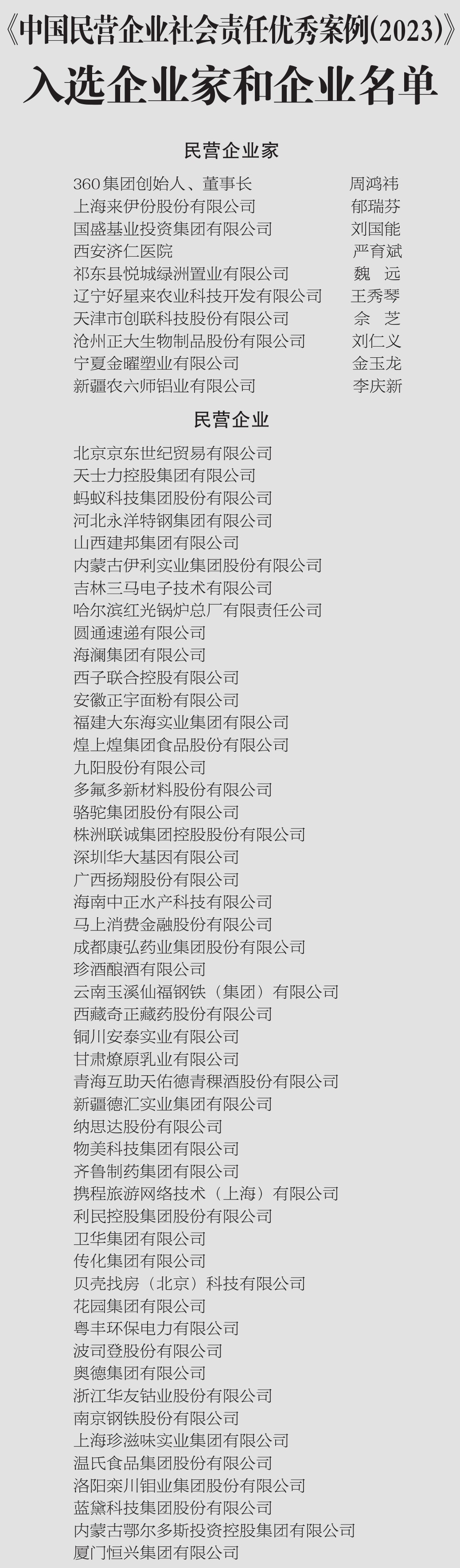《中国民营企业社会责任优秀案例(2023)》入选企业家和企业名单