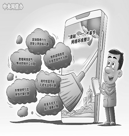 记者1月29日从中央网信办获悉,为营造喜庆祥和的春节网上氛围,中央网信办即日起开展为期1个月的“清朗·2024年春节网络环境整治”专项行动,聚焦春节期间网民常用的平台环节和服务类型,集中整治人民群众反映强烈的网络生态突出问题,切实净化网络环境。专项行动重点整治6方面问题,包括:宣扬猎奇行为、违背公序良俗问题;散播网络戾气、煽动群体对立问题;炮制虚假信息、恶意营销炒作问题;色情赌博引流、网络诈骗问题;鼓吹炫富拜金、无底线追星问题;危害未成年人身心健康问题。