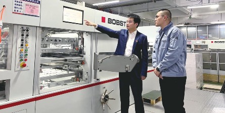 (图)建峰印业总经理杨思侠(左)和技术人员探讨新设备的数字化高精度自动控制系统