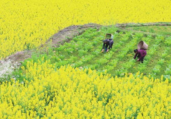 3月17日,在贵州省黔东南苗族侗族自治州岑巩县注溪镇周坪村,村民在田间劳作。春分将至,气温逐渐升高,各地农民积极开展农事活动,田间地头一派忙碌景象。