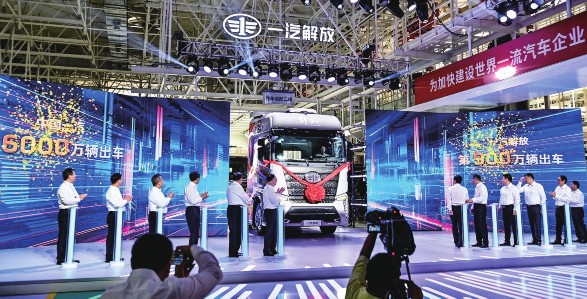 我国自主研发的第900万辆解放牌卡车出车
