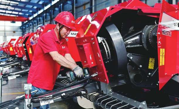 日前,在位于济宁市兖州区的爱科(济宁)农业机械有限公司,工作人员在生产打捆机。近年来,山东省济宁市兖州区大安镇坚持把发展农机产业作为推动乡村振兴的重要抓手,积极对接支农惠农政策,支持农机企业科技研发、产品升级改造。目前,该镇共有农机相关企业100余家,年总产值近20亿元,呈现出产业规模日渐壮大、产品结构日趋优化、产品配套体系较为完善的农机产业集群化发展格局。