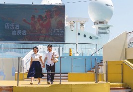 日前,由上海市虹口区政府与上海现代服务业联合会共同主办的“海上甜爱路”启航活动在靠泊于上海港国际客运中心码头的“蓝梦之歌”邮轮上举办。该活动作为2024上海首届国际邮轮节的系列活动之一,旨在推动邮轮经济与甜蜜产业融合联动,助力消费扩容升级,引领市民及游客深度体验邮轮文化与上海城市魅力。图为一对新人在“蓝梦之歌”邮轮上参观。新华社发田益铭/摄