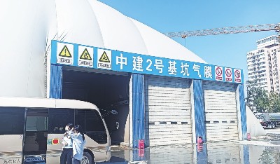 “基坑气膜是一种兼具防尘性、降噪性、节能性、防火性、智能性的绿色施工新工艺。无需任何梁柱,可以创造更大的完全净空的施工空间。气膜内装有智能控制体系、智能检测报警系统、消防系统、通风系统,保障安全施工。”谷强表示。