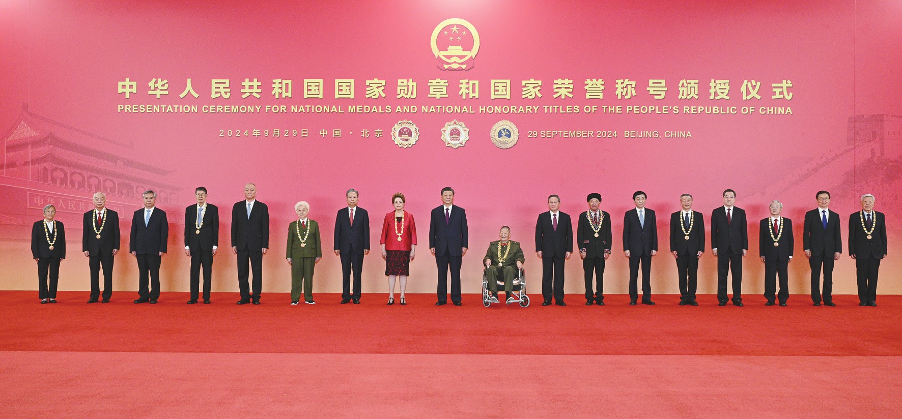 蔡奇宣读习近平签署的中华人民共和国主席令。主席令指出,为了庆祝中华人民共和国成立75周年,隆重表彰为新中国建设和发展作出杰出贡献的功勋模范人物,弘扬民族精神和时代精神,根据第十四届全国人民代表大会常务委员会第十一次会议的决定,授予王永志等4人“共和国勋章”,授予迪尔玛·罗塞芙“友谊勋章”,授予王小谟等10人国家荣誉称号。