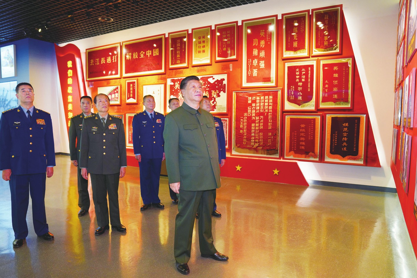 随后,习近平参观了空降兵军军史馆。该军是一支历史厚重、功勋卓著的英雄部队,革命战争年代历经战火硝烟洗礼,抗美援朝战争上甘岭战役中打出了国威军威,和平建设时期出色完成一系列重大任务,涌现出一大批英雄集体和英模人物。习近平仔细观看展陈,认真听取讲解。他叮嘱大家,要用好红色资源优势,教育引导官兵把光荣传统弘扬好,争做新时代英雄传人。
