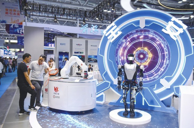 11月14日,在深圳举行的第二十六届中国国际高新技术成果交易会上,参观者在了解一款机械臂。当日,为期三天的第二十六届中国国际高新技术成果交易会在深圳国际会展中心(宝安)开幕。来自100余个国家和地区的5000余家知名企业与国际组织参展,4300余个新技术、新产品、新成果将同期发布。