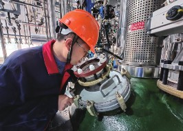 近年来,山东省日照市高度重视生命健康产业发展,把生命健康产业链作为重点产业链予以重点培育,产业规模不断集聚壮大。图为日照正济药业有限公司,车间操作工在观察反应釜内物料状态。新华社记者才扬/摄