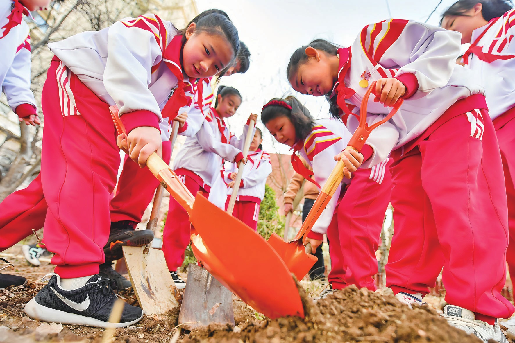 三月十二日,天津市滨海新区塘沽实验小学学生在栽植树木。当日是植树节,各地开展植树活动,为春天增绿添彩。新华社发杜鹏辉/摄
