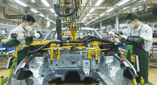 三月二十五日,在位于青岛市即墨区的一汽-大众青岛基地焊装车间,工人进行生产作业。近年来,青岛市即墨区围绕汽车产业高端化、智能化、绿色化、集群化发展目标,持续鼓励车企加快科技创新步伐,打造具有竞争优势的汽车产业集群。目前,即墨区拥有一汽-大众、一汽解放、奇瑞等乘用车、商用车、改装车及配套企业四百余家,年产整车四十五万辆。新华社发梁孝鹏/摄