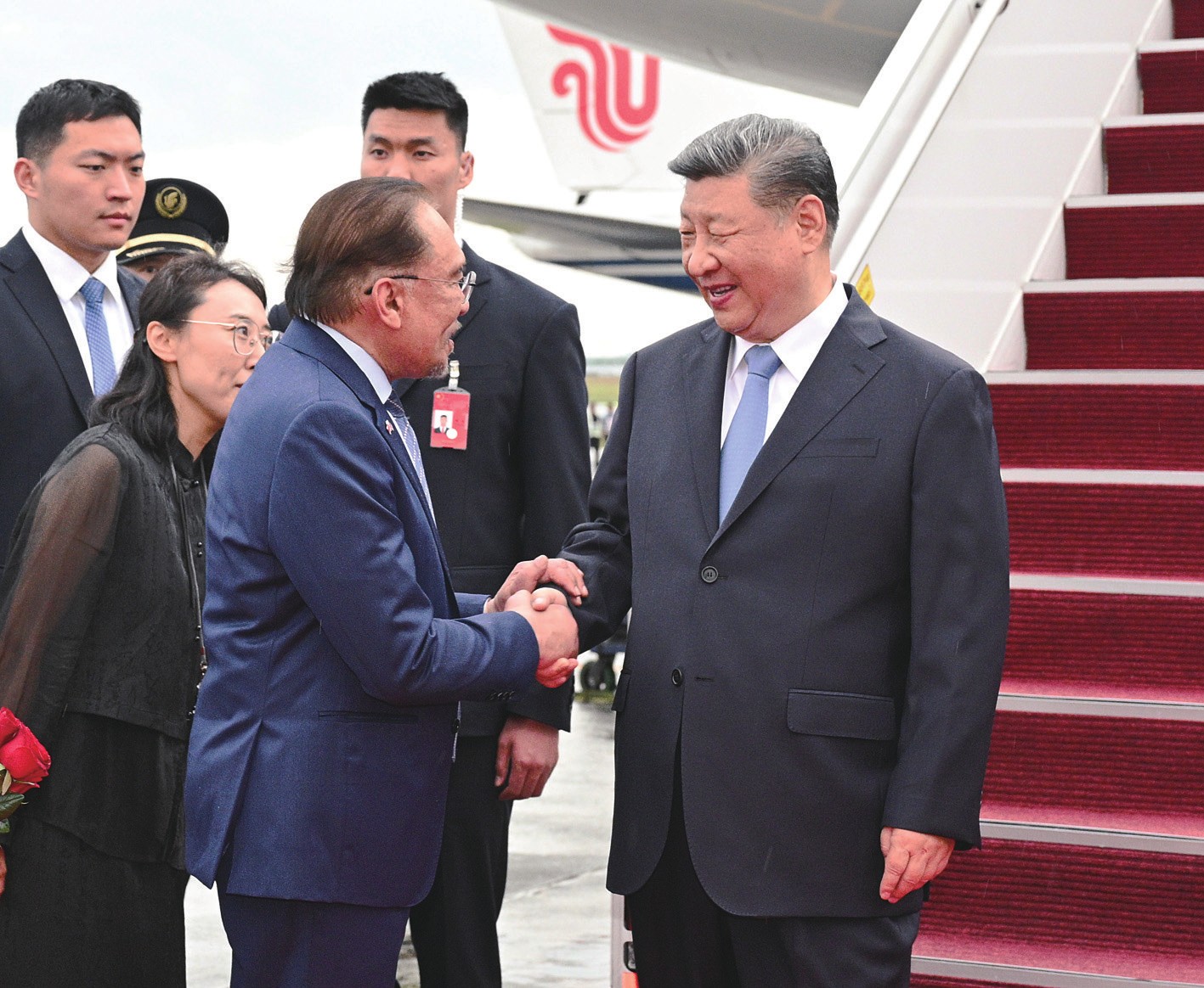 专机抵达吉隆坡国际机场时,马来西亚总理安瓦尔,外交部部长穆罕默德,陪同部长、交通部部长陆兆福等高级官员热情迎接。马来西亚儿童向习近平献花,马来西亚青少年表演富有当地特色的舞蹈,挥舞中马两国国旗,热烈欢迎习近平到访。
